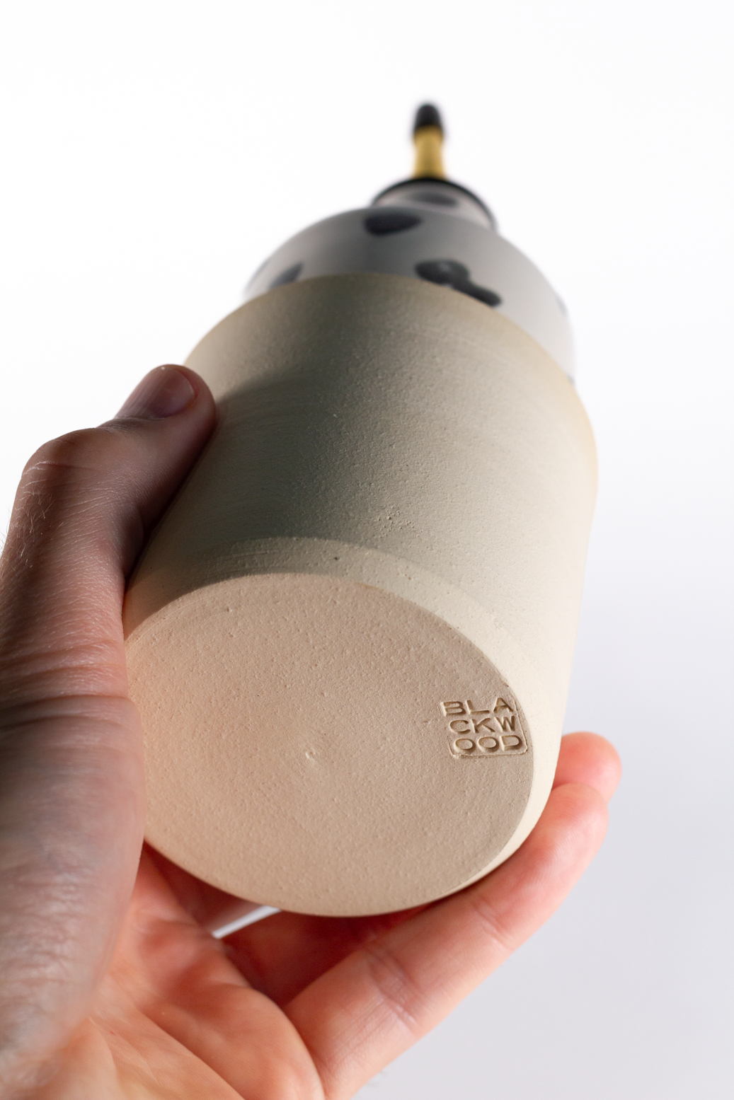 This single large oil bottle was hand-thrown on the wheel in my shop, and is made with white stoneware clay finished in a glossy dalmatian glaze.