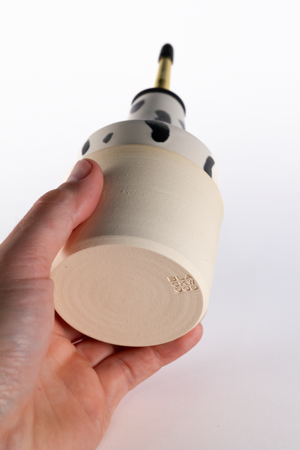 This single small oil bottle was hand-thrown on the wheel in my shop, and is made with white stoneware clay finished in a glossy dalmatian glaze.