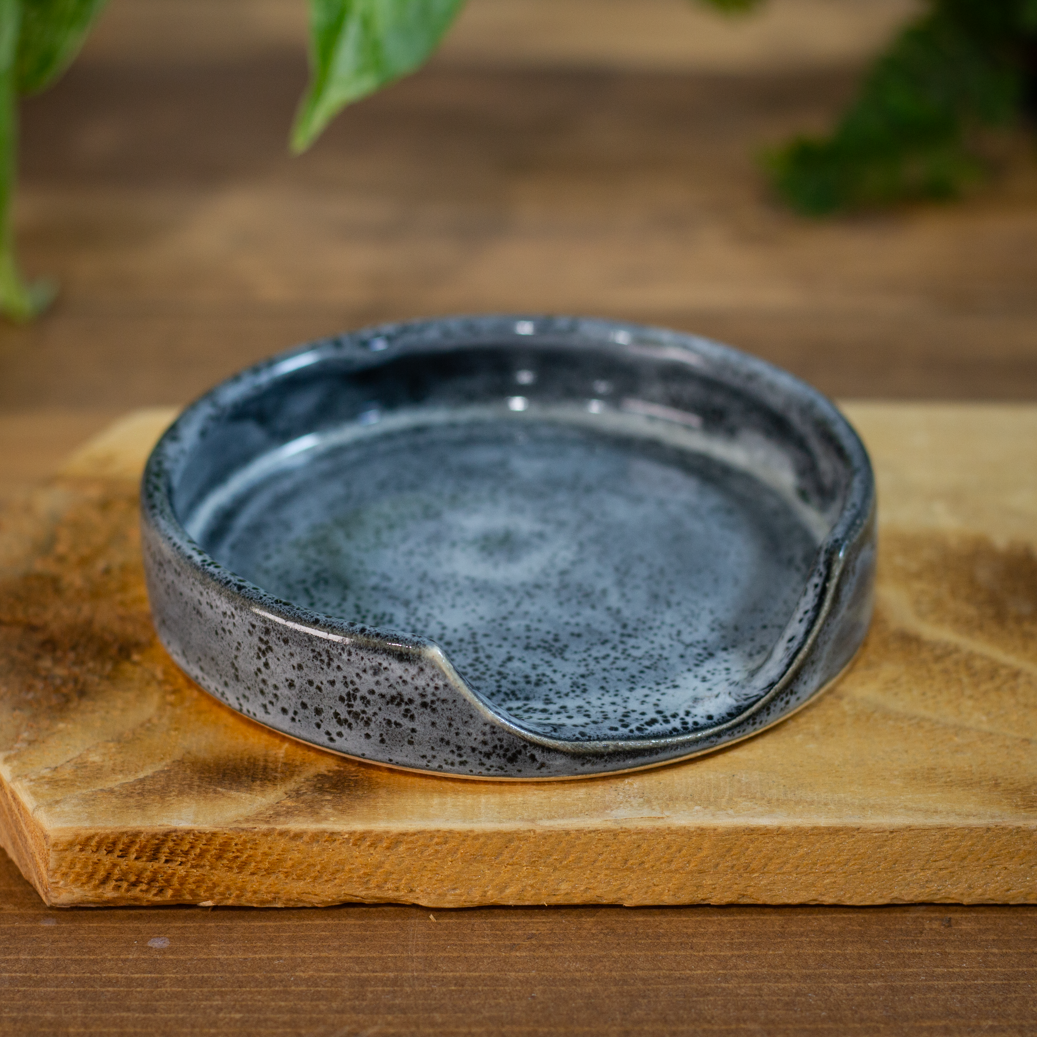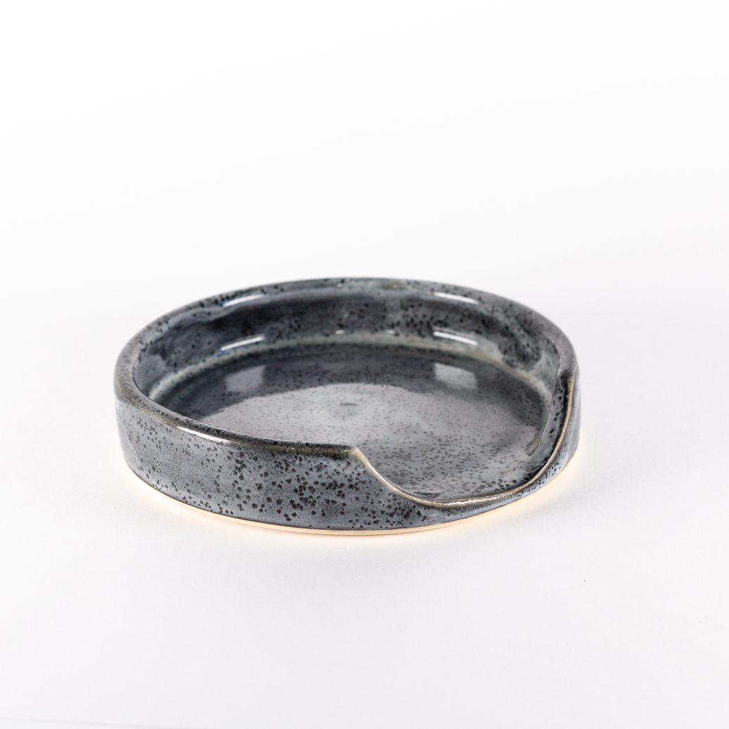 This single spoon rest was hand-thrown on the wheel in my shop, and is made with white stoneware clay finished in a glossy charcoal glaze.